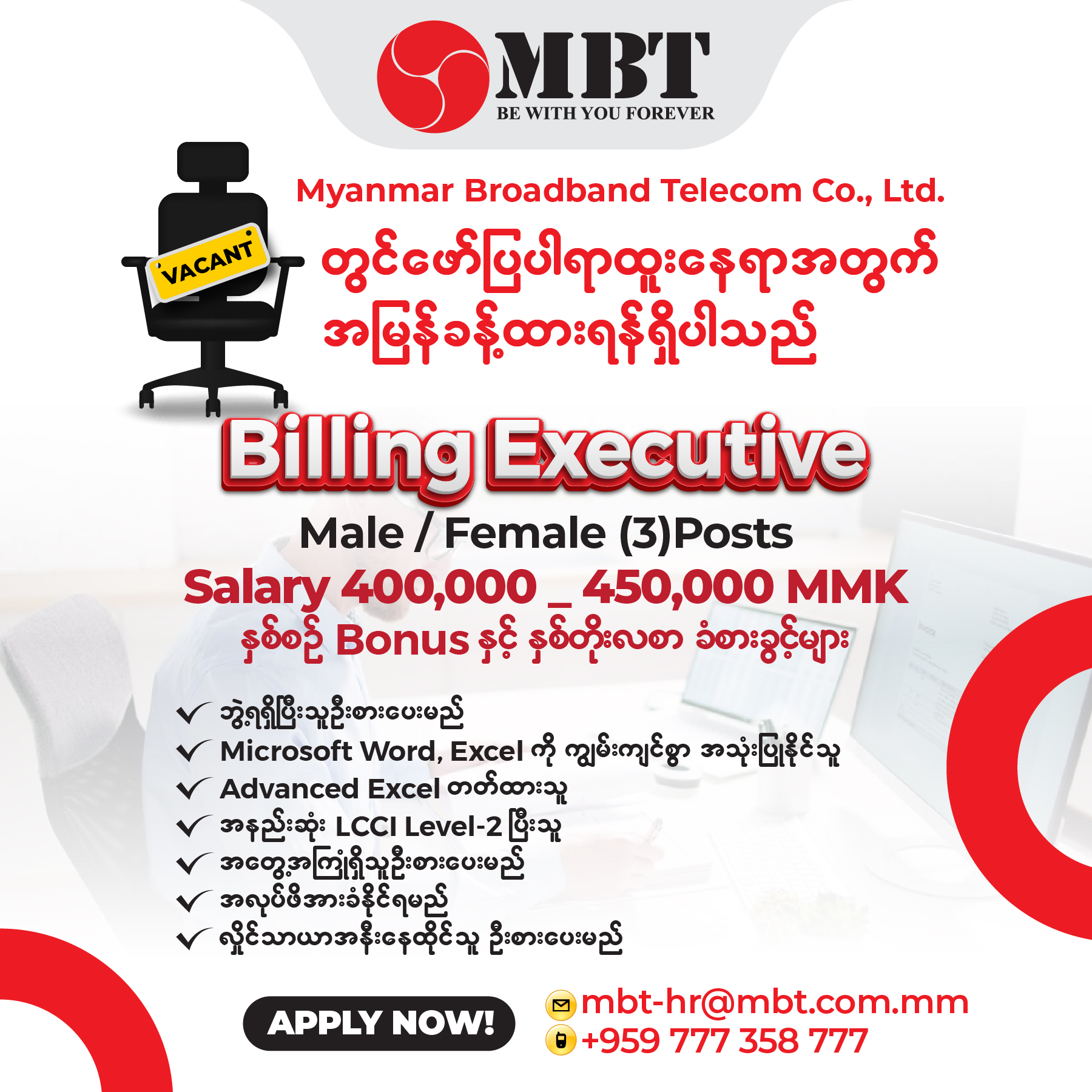 Myanmar Broadband Telecom Co.,Ltd(MBT)ရုံးခွဲများတွင် တာဝန်ထမ်းဆောင်ရန် Billing Coordinator ကျား/မ(၈)ဦးခေါ်ယ...