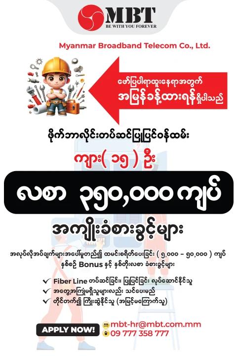 Myanmar Broadband Telecom (MBT) Wifi Company မုံရွာမြို့ရုံးခွဲတွင် တာဝန်ထမ်းဆောင်ရန် 👈👈👈 📣 ဖိုက်ဘ...