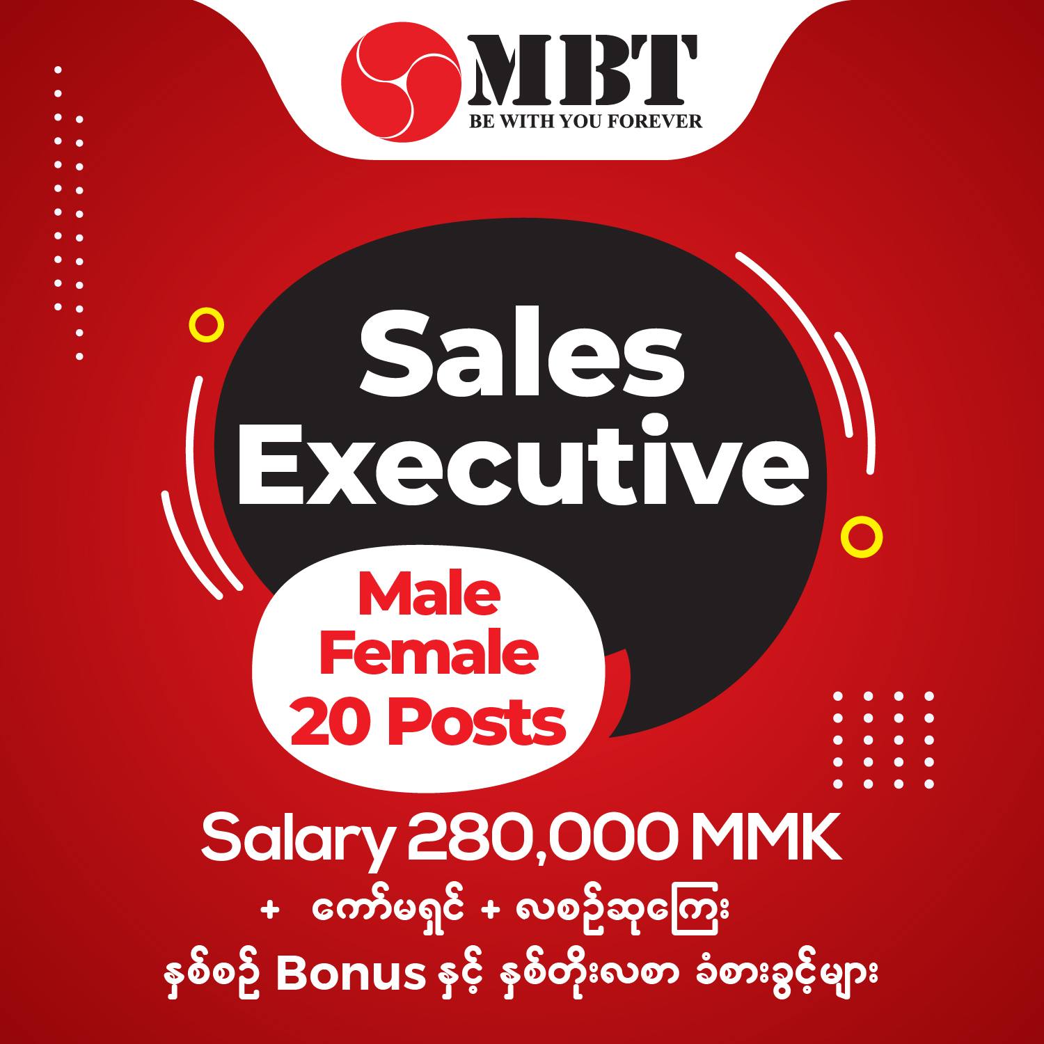 💰လစာ 280,000 + ကော်မရှင် + လစဥ်ဆုကြေး ## နှစ်စဉ် Bonus နှင့် နှစ်တိုးလစာ ခံစားခွင့်များ ## လိုအပ်နေသည့် ရုံးခွဲ - ဗဟန်းမြို့နယ် လိုအပ်ချက်များ ✅ Door to Door ဆင်းနိုင်ရမည်။ ✅ ချမှတ်ထားသည့် အရောင်းTarget ပြည့်မှီအောင်ဆောင်ရွက်နိုင်ရမည်။ ✅ သက်ဆိုင်သည့် လုပ်ငန်းအတွေ့အကြုံရှိသူဦးစားပေးမည်ဖြစ်ပြီး၊ အရောင်းအတွေ့အကြုံမရှိသူများလည်း လျှောက်ထားနိုင်ပါသည်။ လျှောက်ထားလိုသူများသည် 09777358777 သို့ CV Form ပေးပို့၍ လည်းကောင်း ၊ ရုံးလိပ်စာ - အမှတ်(၂၀) မြေညီထပ်၊ပွဲစားတန်းလမ်း၊နတ်ချောင်းရပ်ကွက်၊တာမွေမြို့နယ် သို့လည်း‌ကောင်း လာရောက်လျှောက်ထားနိုင်ပါသည်။