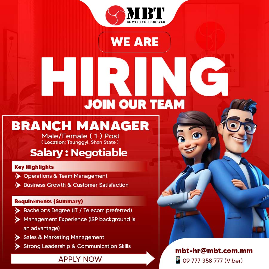 Position : Branch Manager Salary : Negotiable Location : Taunggyi, (Shan State) Job description Myanmar Broadband Telecom Company Limited, one of Myanmar’s leading Internet Service Providers (IS...