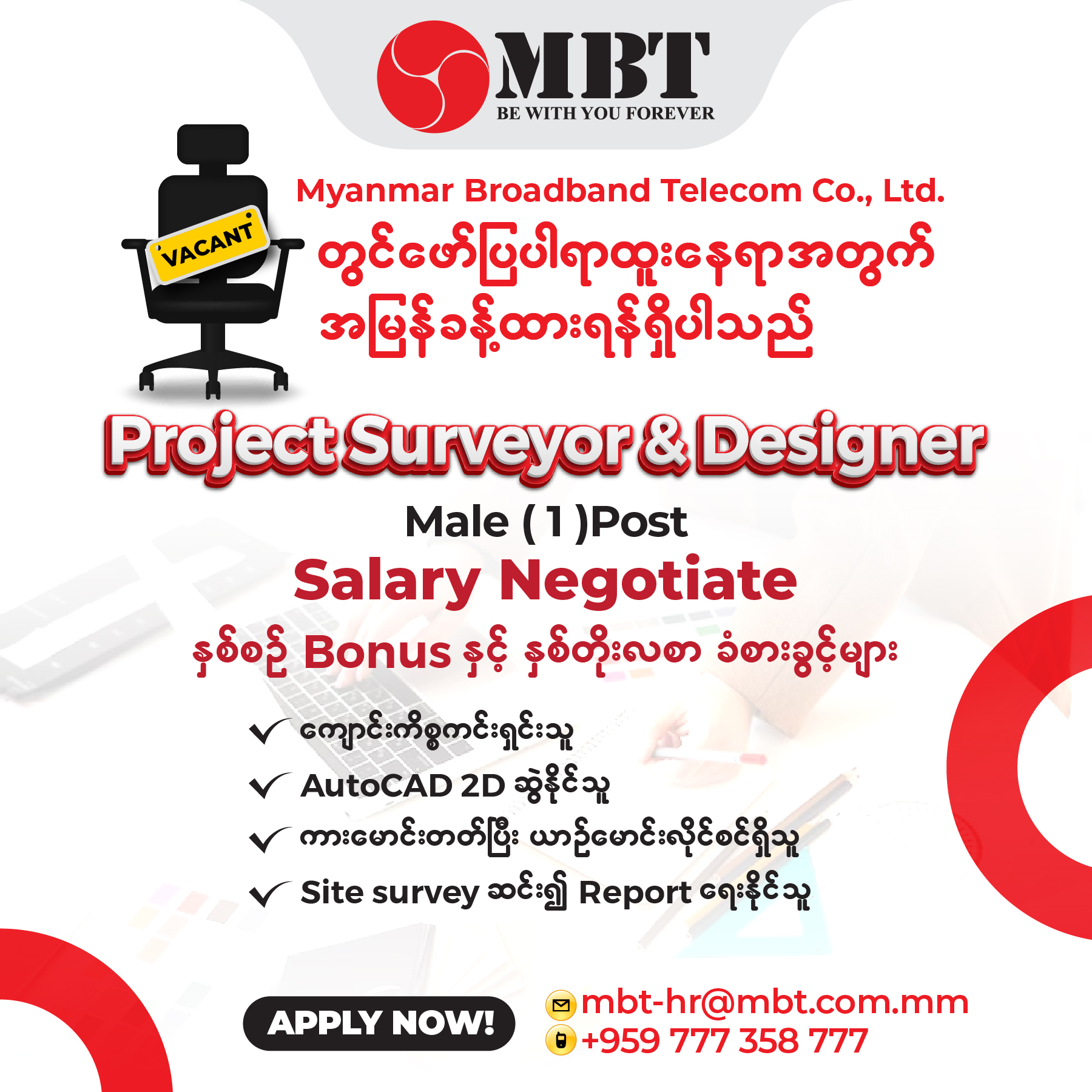 လျှောက်ထားလိုသူများသည် 09777358777 (or) mbt-hr@mbt.com.mm သို့ CV Form ပေးပို့၍ လည်းကောင်း၊ ရုံးလိပ်စာ - FMI City၊ အမှတ်(L69/70)ခရေပင်လမ်းနှင့် ကန်ရိပ်သာလမ်းသွယ်(၅)လမ်းထောင့်၊ လှိုင်သာယာမြို့နယ် သို့လည်း‌ကောင်း လာရောက်လျှောက်ထားနိုင်ပါသည်။